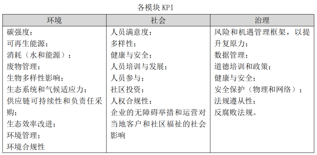 生态系统和气候适应能力等方面;社会指标包括员工满意度、多样性、健康和安全、人员培训和发展、社区投资等方面;治理指标包括道德、价值创造、ESG政策、风险与机遇管理、