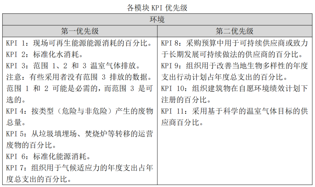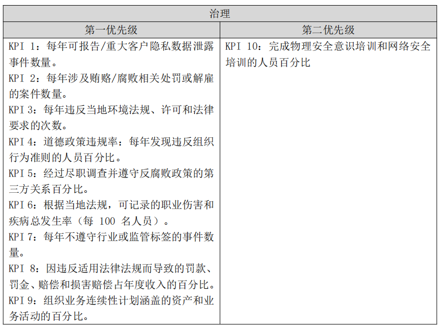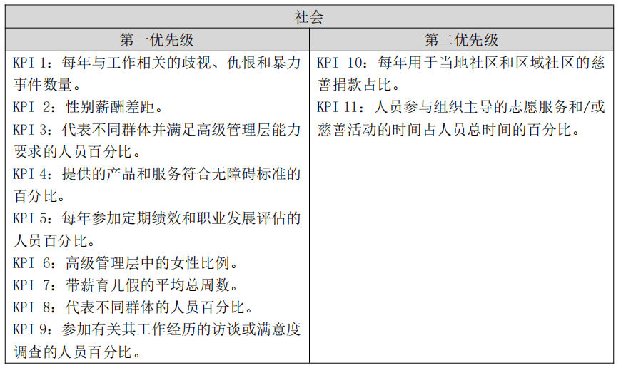 合规性和问责制等方面。指标体系分为优先绩效指标和次要绩效指标,适用于全球各个行业、不同规模的企业和组织,尤其是跨国公司、中小型企业(SME)中希望参与ESG实践的高层领导者。